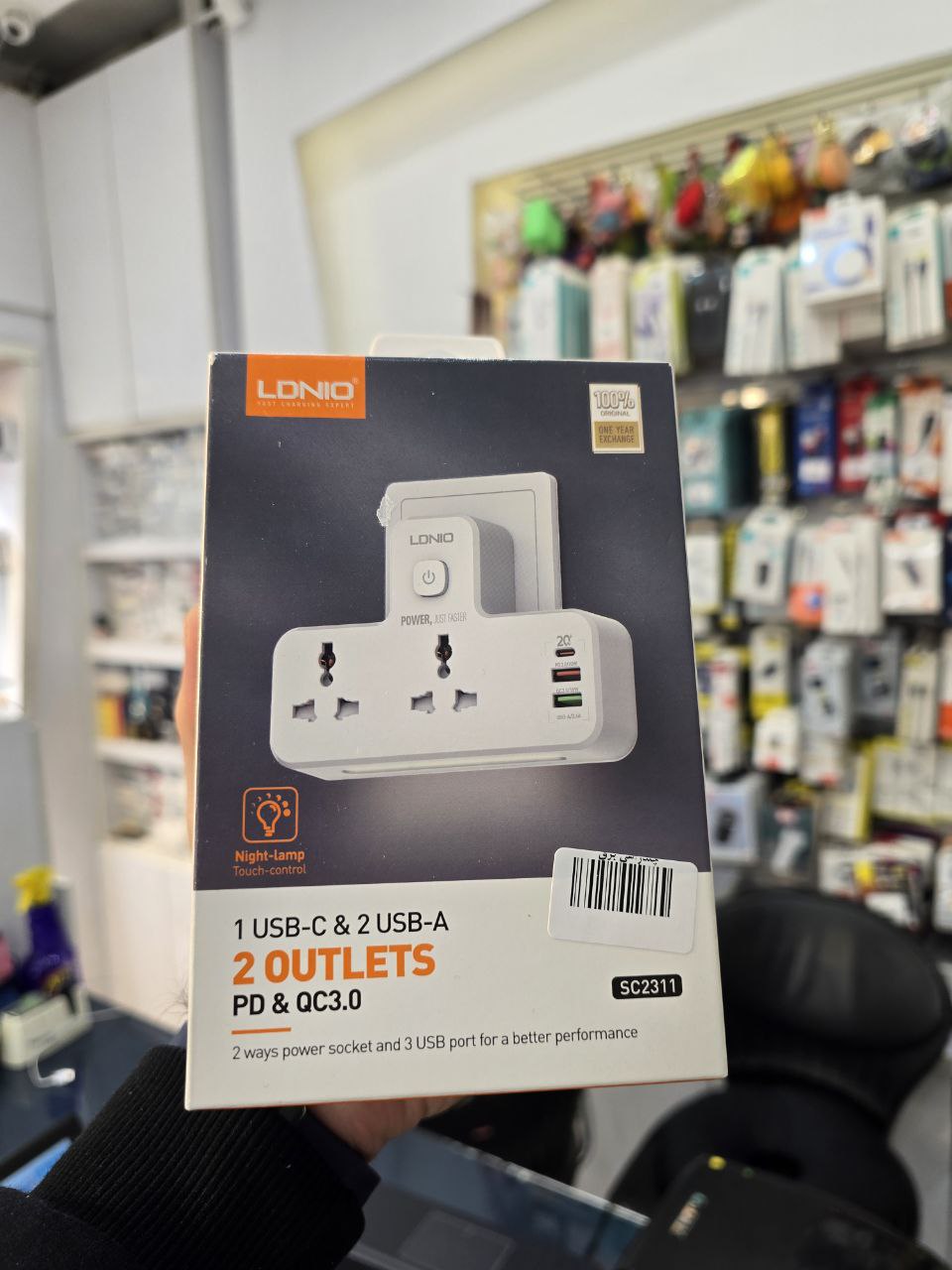 چند راهی برق فست شارژ با 2 سوکت پریز برق، 2 پورت USB مجهز به فناوری QC3.0 و یک عدد پورت Type-C با فناوری شارژ سریع PD3.0
